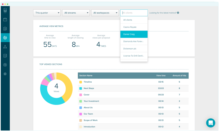 - Live proposal analytics: Track views, engagement, and completion in real time