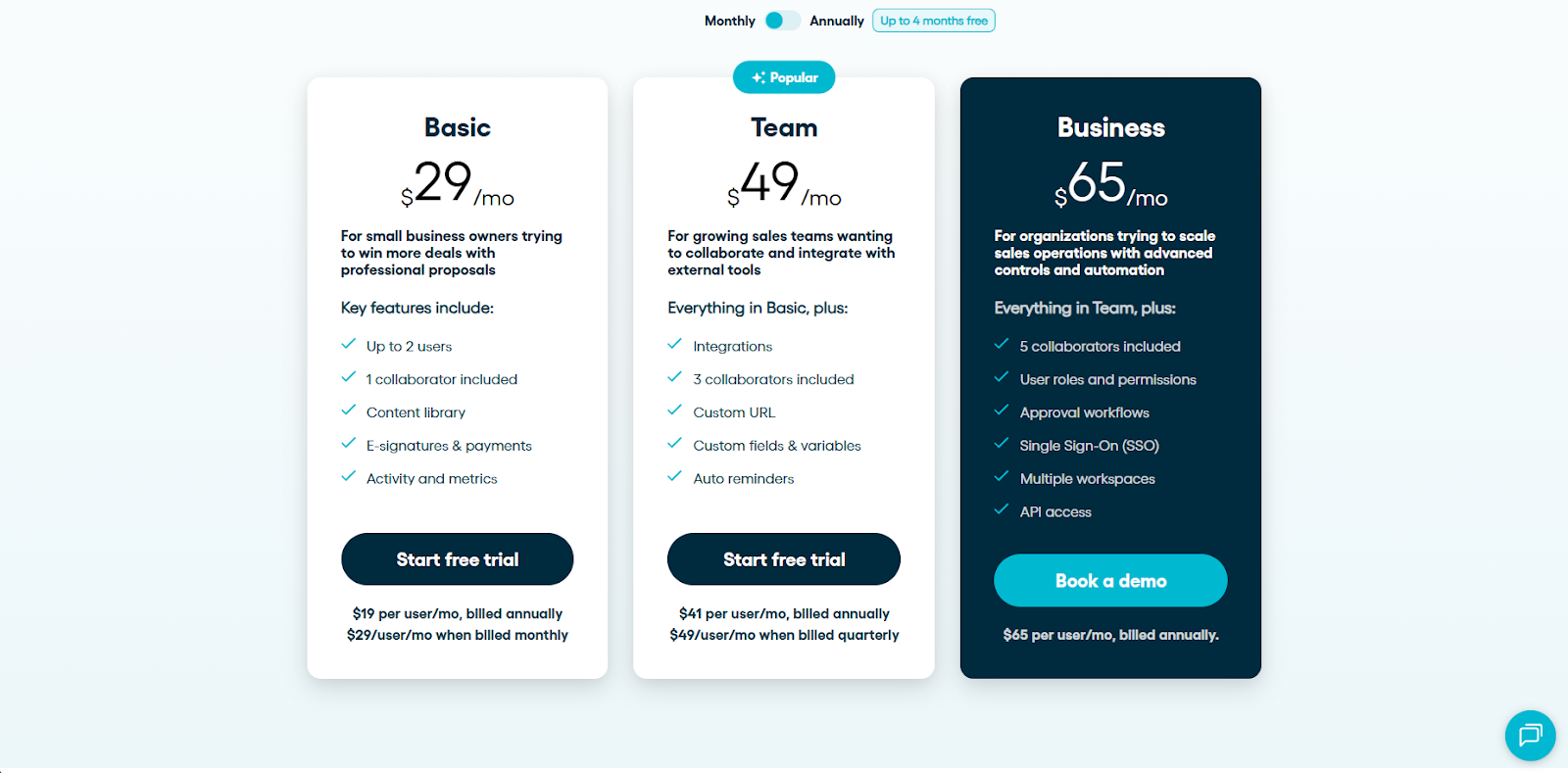 Proposify immediately presents you with a list of features and the price you pay to access them. Its three plans cater to businesses of different sizes and provide access to effective templates, seamless integration, and document tracking in a single platform. With Proposify, you can add value to your services without breaking the bank.