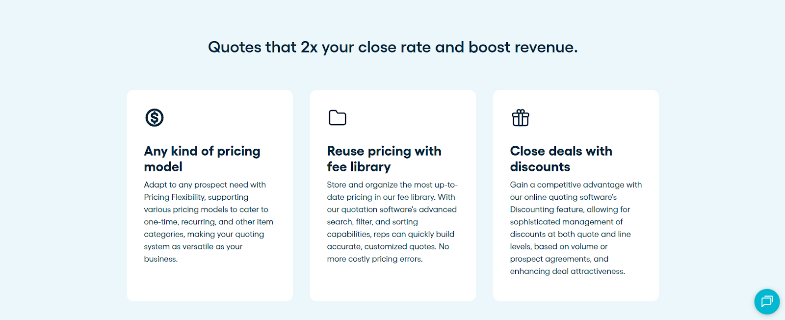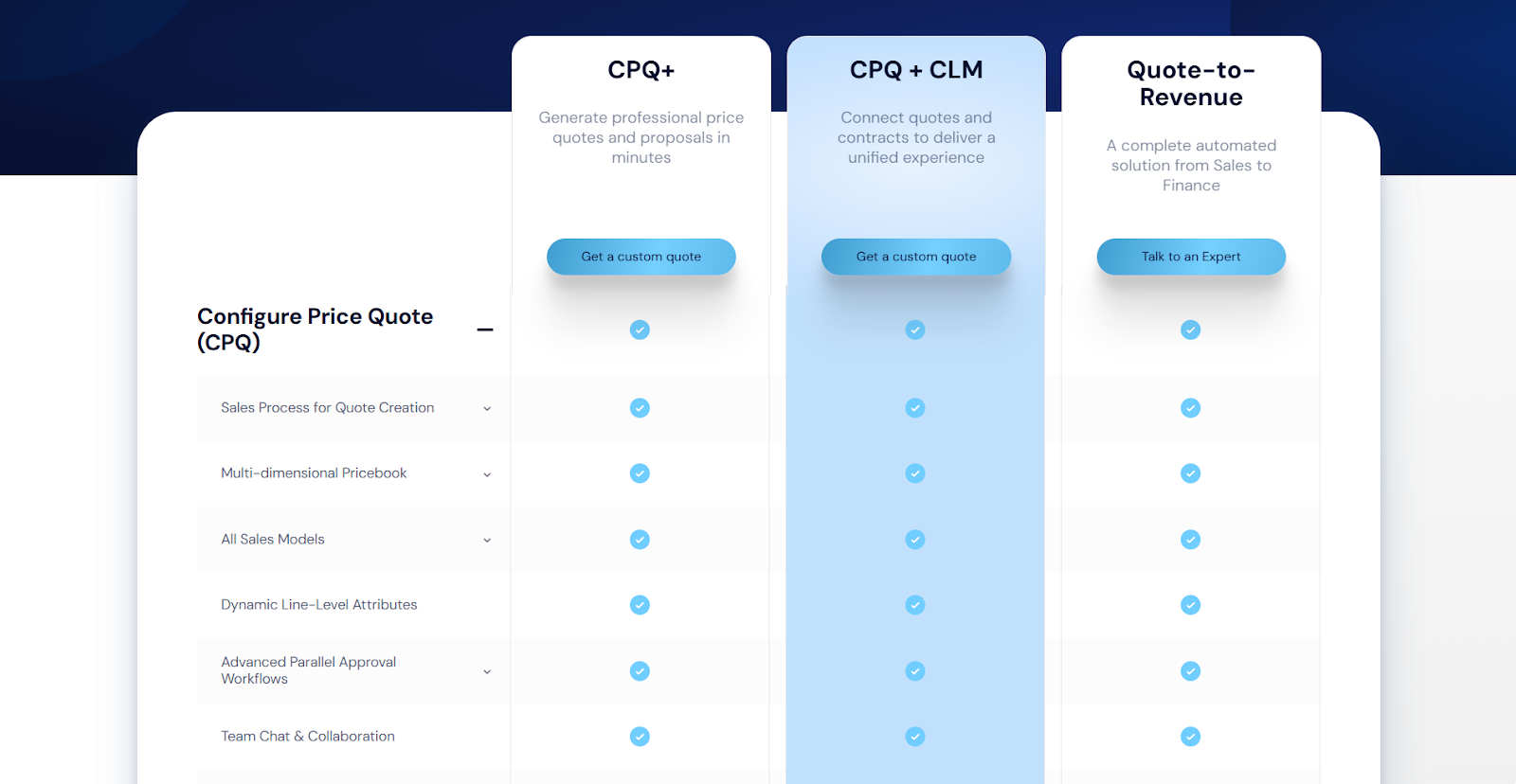 DealHub’s CPQ+ plan is ideal for users who only need professional price quotes and proposals. It supports chats and collaboration across teams of different sizes. The following features are available on the CPQ+ plan: