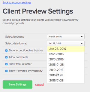 Much like the currency formatting, being able to customize your proposal date format will help solidify your voice in your client's language.