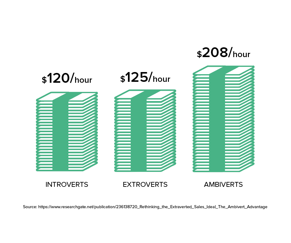 In another study, research found that introverted salespeople earned on average $120/hour, extroverts $125/hour, and ambiverts cleaned up at $208/hour.