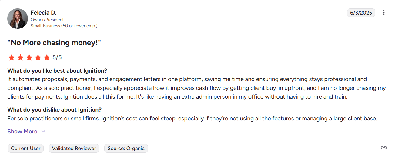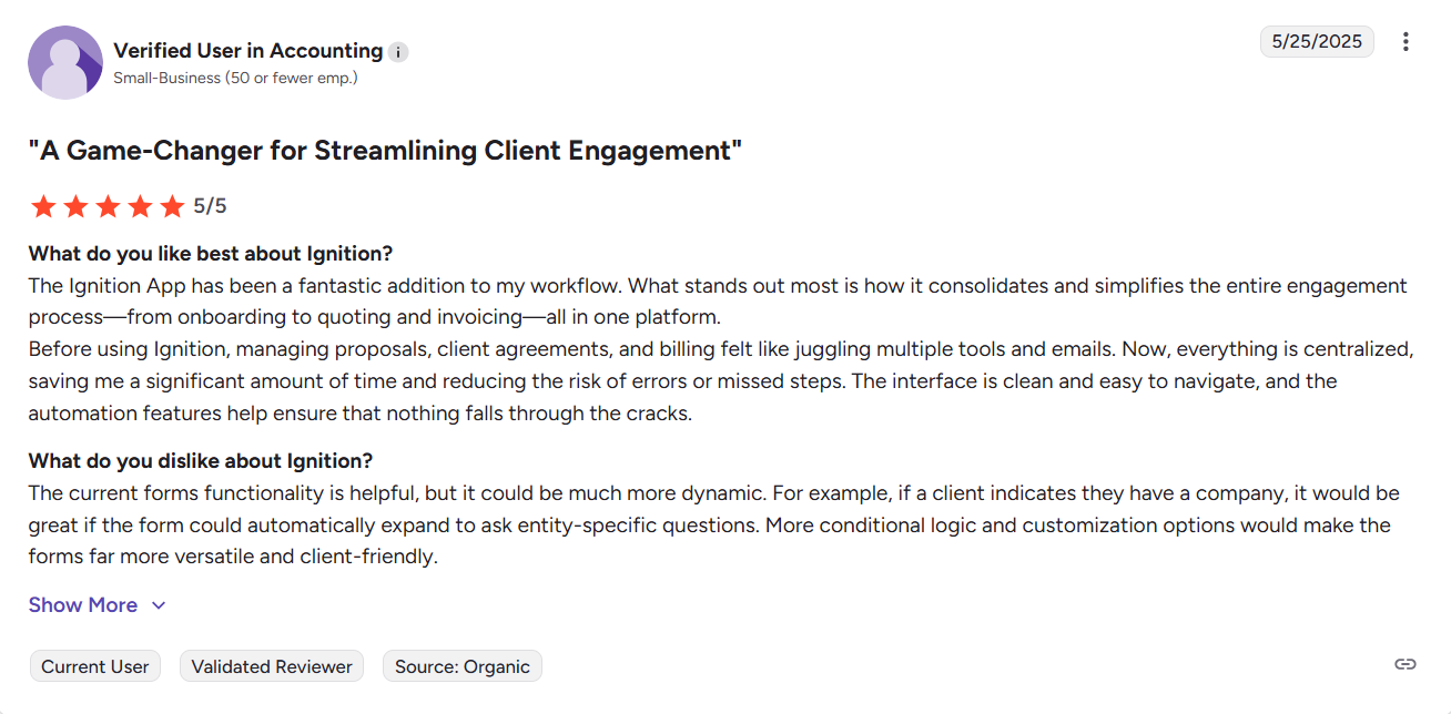 Ignition’s pricing centers on downstream features like payments, client management, and add-ons that extend beyond the core job of winning new business. For accounting teams focused on closing and scaling client engagements, this structure can mean paying for functionality they use less frequently