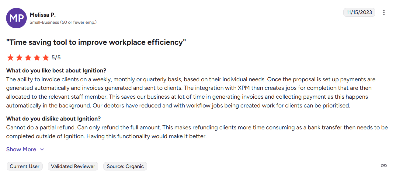 Some users have noted that Ignition has long payment processing times, issues handling end-of-month fees, and no option to issue partial refunds inside the platform.