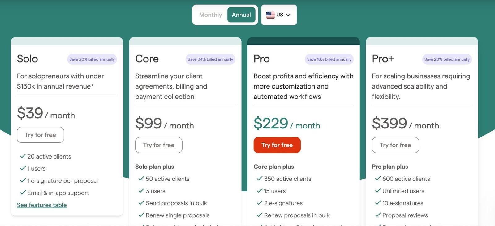 The Solo plan is built for independent practitioners and solopreneurs with up to 20 active clients who want to formalize proposals and agreements without complex billing needs. It costs $39/month and includes basic proposal tools, limited , and essential billing features.