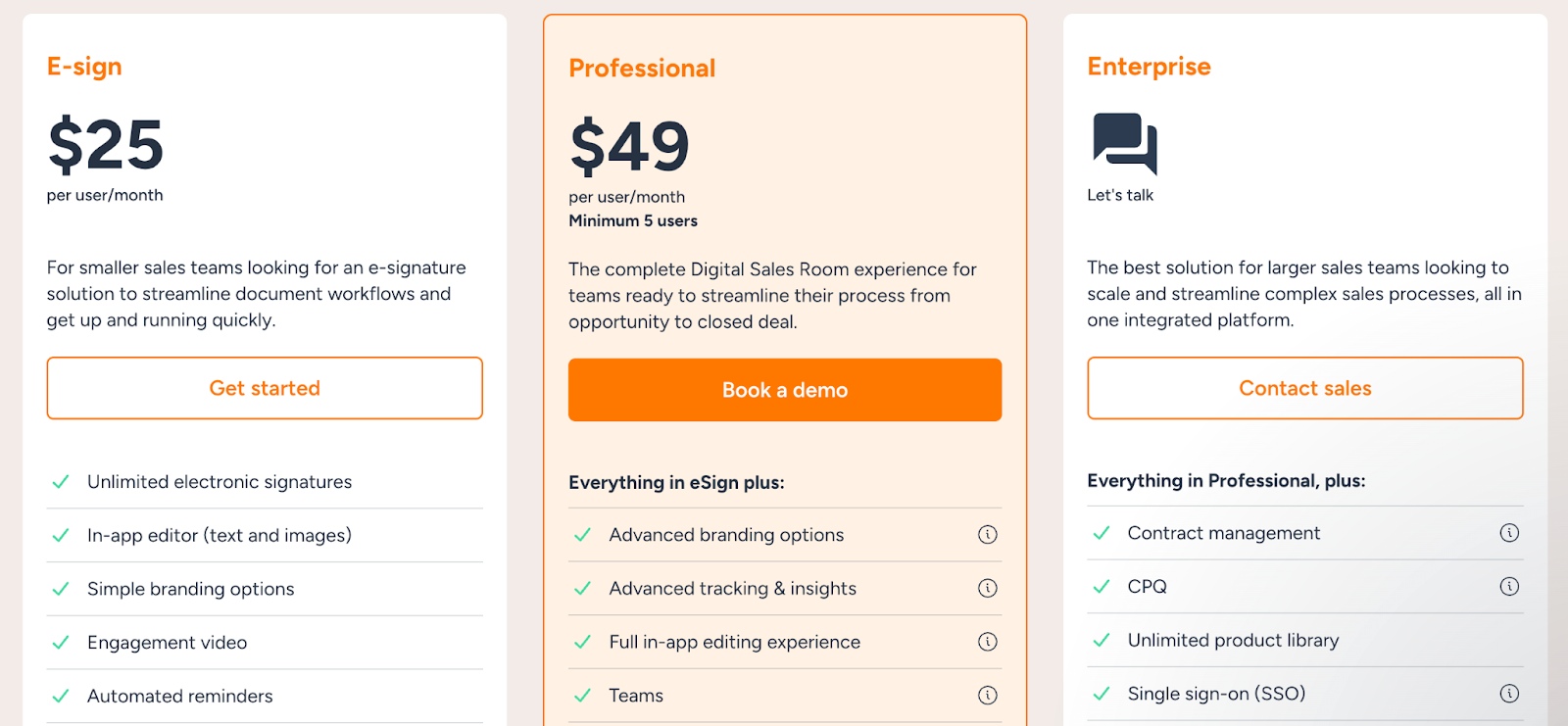 - Professional ($49 /per user/per month): For advanced teams who need to streamline their proposal closing process.
