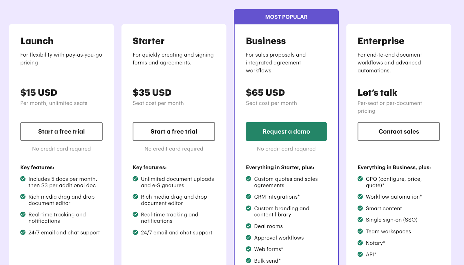 - Business ($65/month): For sales proposals and more advanced workflows.