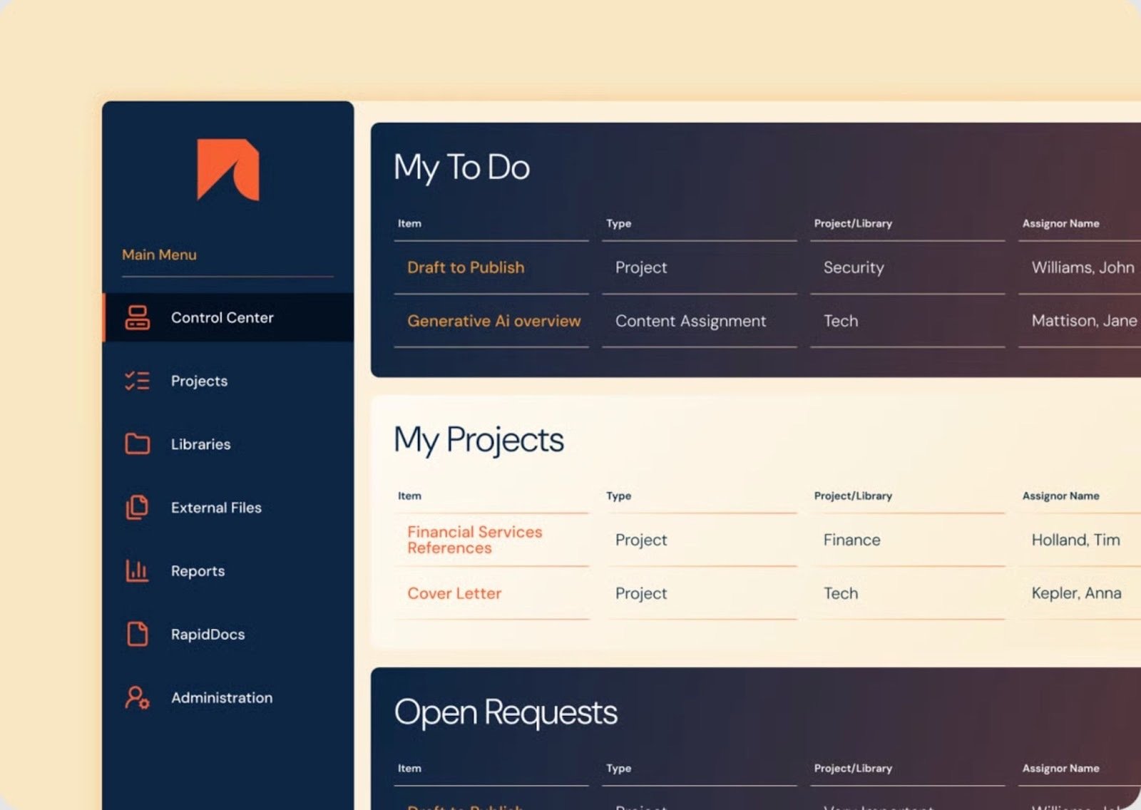 - Auto-import and draft generation for RFPs/Questionnaires speed up response building.