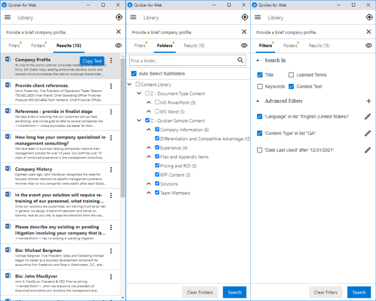 - Content Library: Frequently used content, such as pricing tables, case studies, and testimonials, can all be stored in a centralized content library. This feature facilitates the RFP response process by ensuring consistency across all documents.
