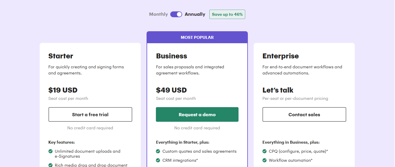 The Free plan provides only basic e-signature functionality, while paid plans provide advanced options like tracking, integrations, and automation. Starter and Business plans are priced based on users and features, and Enterprise is tailored for larger organizations needing custom workflows and integrations.