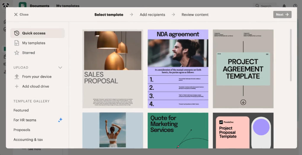 - Document creation: PandaDoc allows you to create professional documents using drag-and-drop tools and a wide selection of templates.