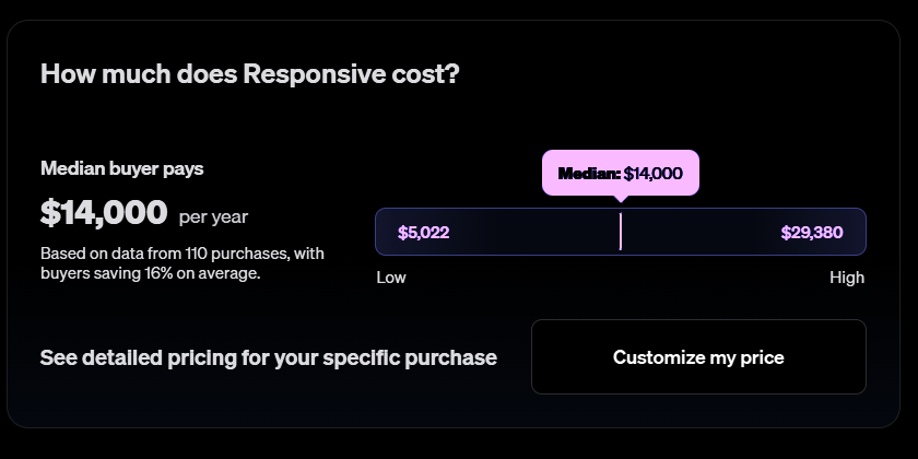 Responsive.io won't tell you what their software costs. Not on their website, at least. You have to sit through multiple demos and hand over your company details. Even then, pricing can vary wildly, depending on negotiation. According to Vendr data, this could be up to $14,000 per year.