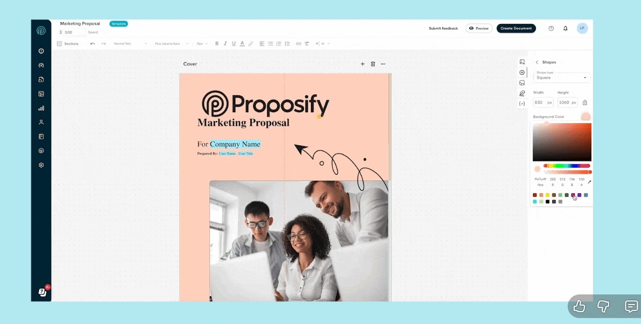 - Faster Path from Idea to Polished Proposal: Drag-and-drop editing, reusable content, and built-in approvals mean less setup and quicker turnaround.