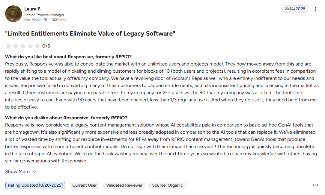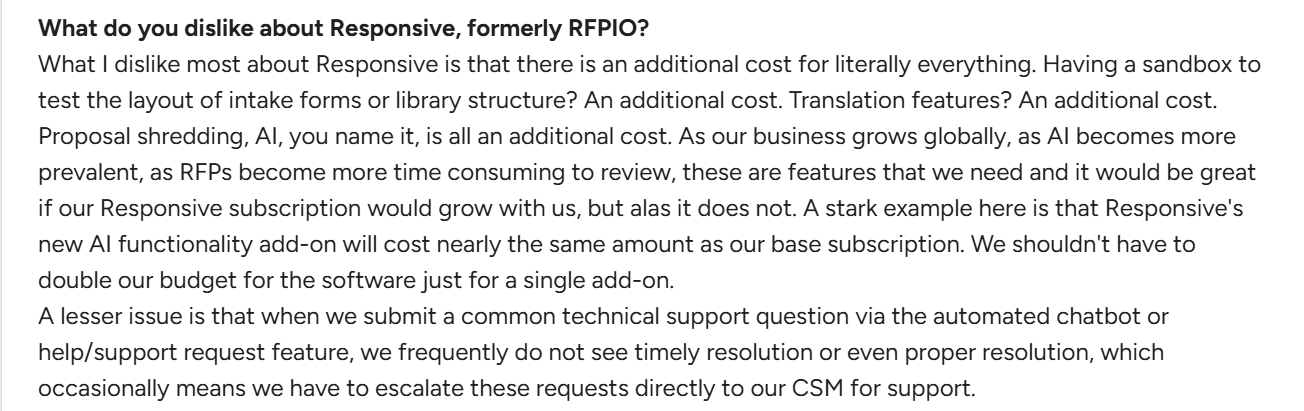 But if you're a lean startup, or a mid-sized sales team whose primary focus is creating and sending proposals—not managing enterprise-grade RFP workflows—Responsive.io’s complexity and opaque pricing model can feel like overkill.
