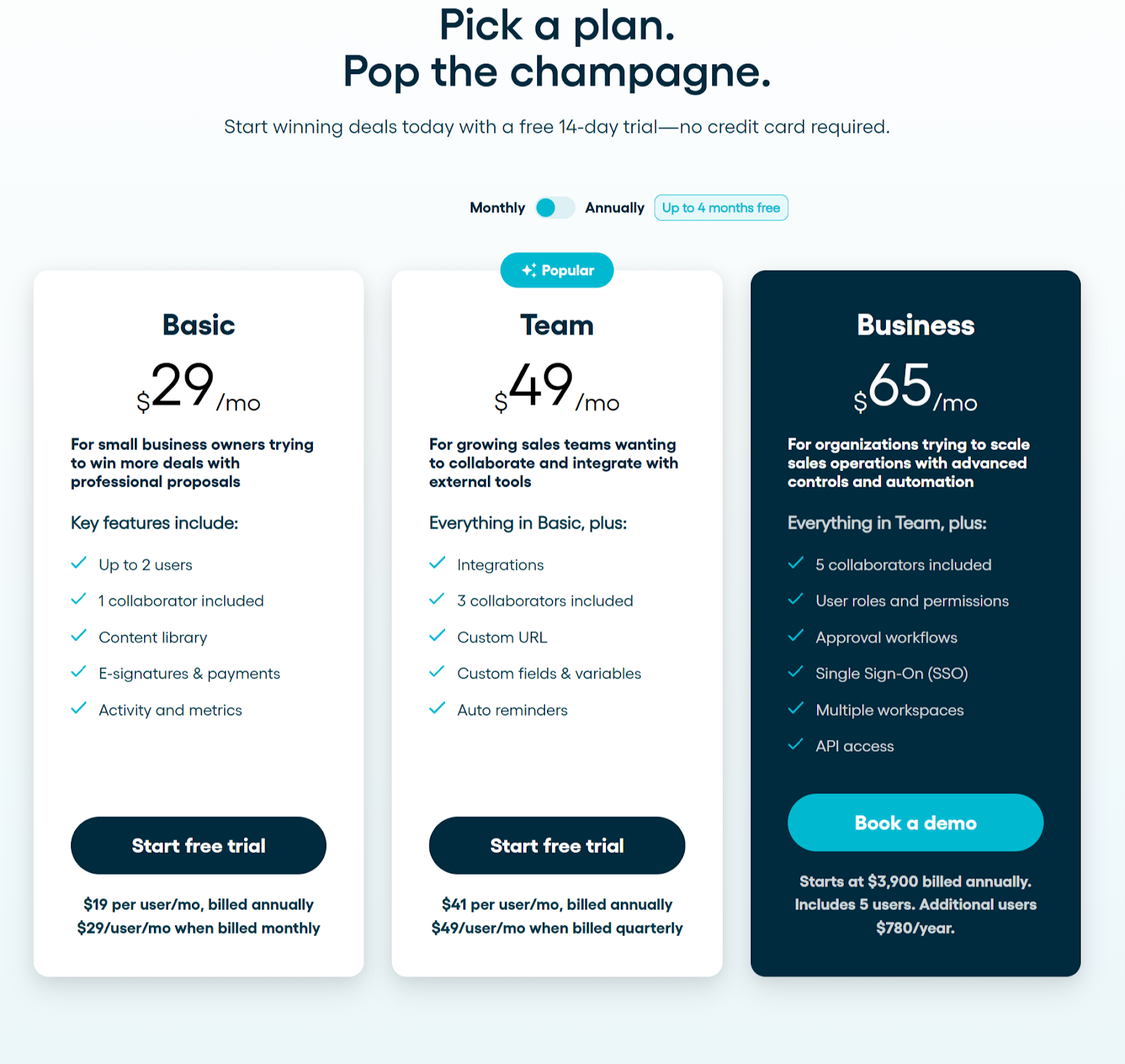 The Business plan suits high-volume teams needing stronger reporting, advanced integrations, and more oversight while keeping proposal creation simple.