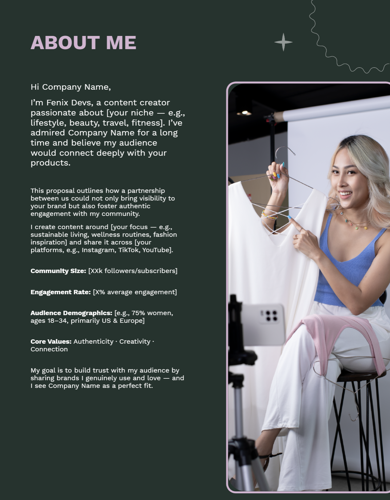 Introduce yourself and establish credibility with sections for your niche, community size, engagement rate, and audience demographics. The template includes space to highlight your core values and what makes your content approach unique to potential brand partners.