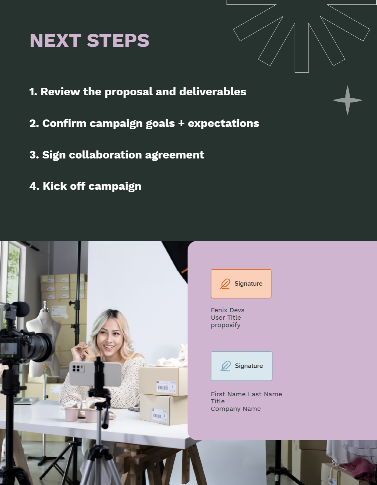 A clear 4-step process for moving forward with the partnership. The template includes signature fields for both parties, allowing you to finalize agreements directly within the proposal document without additional paperwork.