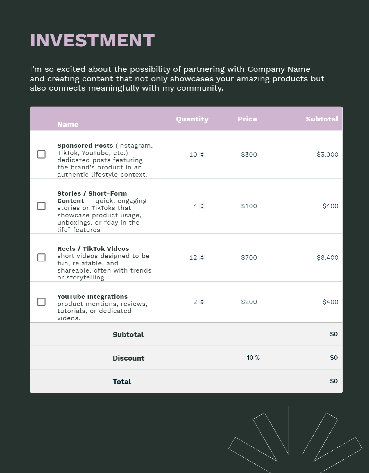 Most successful influencer proposals include tiered options or à la carte pricing. This gives brands flexibility to choose what fits their budget and campaign goals. The template's interactive pricing table makes it easy to present multiple content types with individual pricing that brands can mix and match.