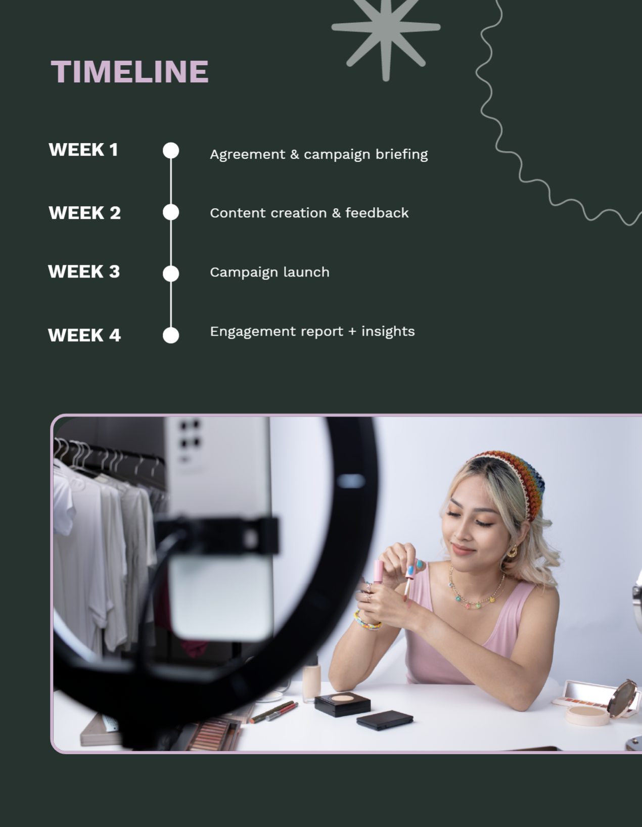 A structured 4-week project schedule that outlines each phase of collaboration. This shows brands you have a professional process and helps set clear expectations for deliverables and milestones throughout the campaign.