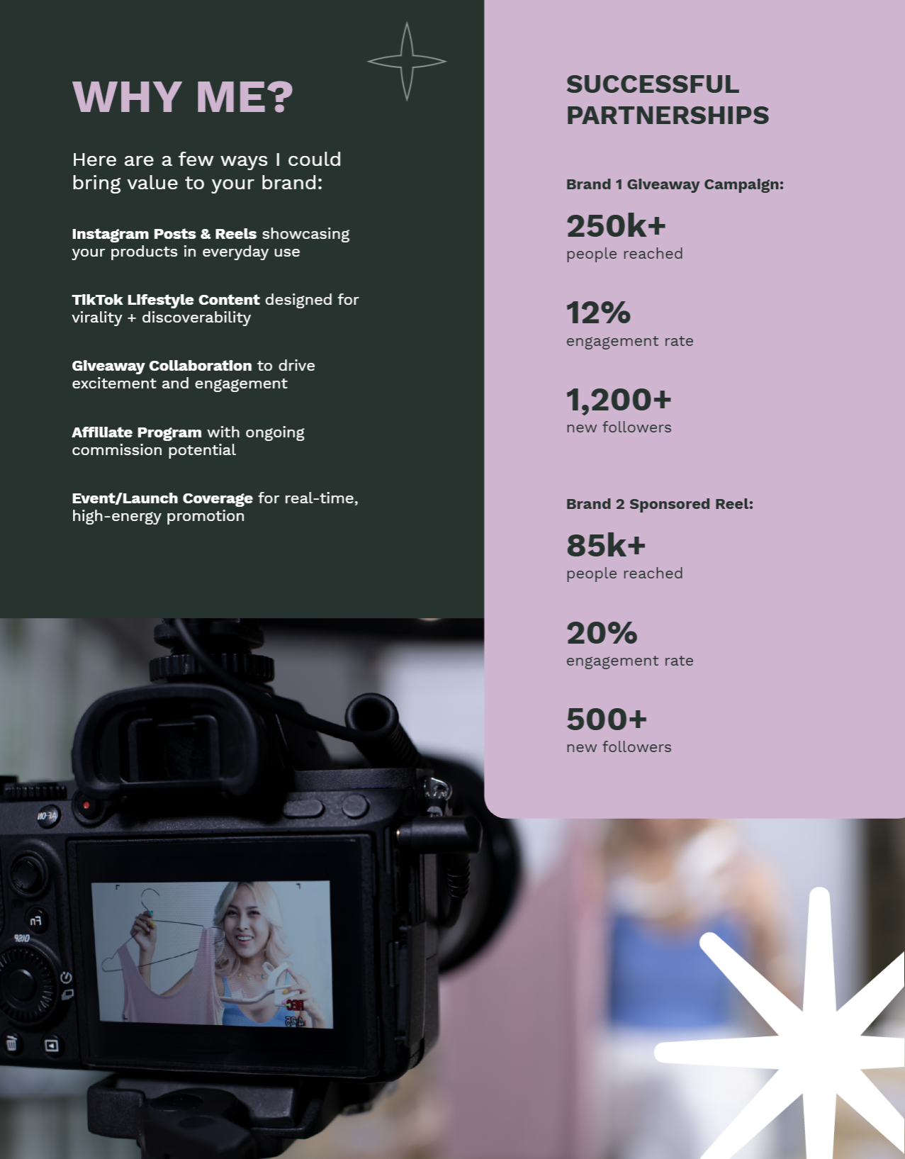 Present your value proposition with specific content offerings like Instagram posts, TikTok content, giveaways, affiliate programs, and event coverage. This section includes a dedicated area to showcase metrics from successful past partnerships that demonstrate your track record and results.